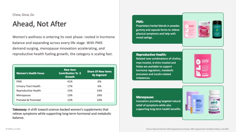 SPINS data shows PMS supplements contributing 41% of new item dollar growth in women’s health, with reproductive health (15%) and menopause (13%) also driving significant new item activity. On the floor, Empress Herbal Powders, FLO Reproductive Health, and PH-D Creatine Menopause Relief each showed how far the category has moved from generic women’s multivitamins.