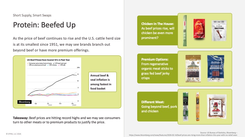 That math is showing up in product development. High-protein meat snacks continue to grow, but chicken is gaining ground in the jerky and meat snacks space as a more accessible price point. On the show floor, game meats — bison, venison, elk — appeared with more frequency, another sign of diversification. Premium beef products are also finding buyers willing to pay up: regenerative organic meat sticks and grass-fed beef jerky crisps were both present, suggesting consumers won’t abandon beef entirely but are increasingly looking for a reason to justify the price.