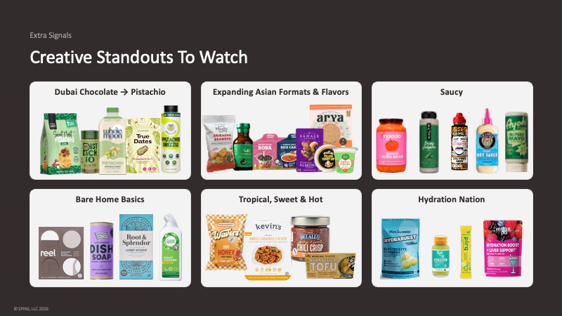 A few other standouts from the floor that don’t fit neatly into a single category: pistachio has survived the Dubai chocolate moment and is now appearing across condiments, snacks, and beverages as a mainstream flavor. Asian flavors and formats continue to see sustained consumer interest. Swicy is holding strong through mango habanero, hot honey, and chili crisp. Hydration has pulled back from triple-digit growth rates but remains in active innovation, with gummy formats, shots, and multi-functional powders that address liver support alongside electrolytes.