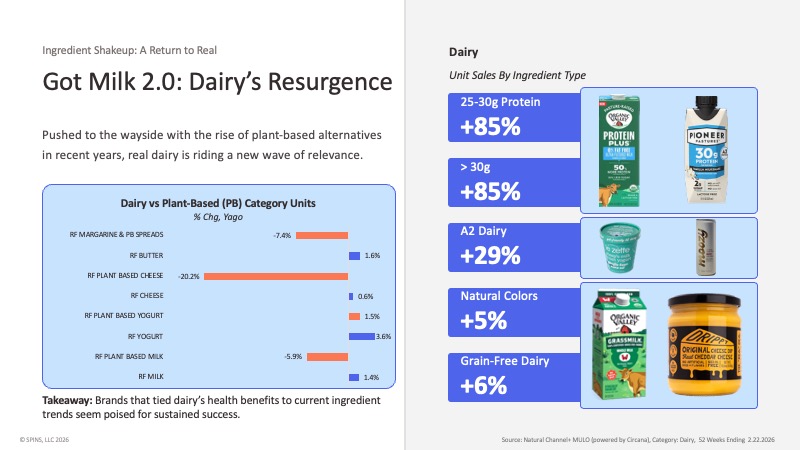 Plant-based dairy has been in retreat across the refrigerated case — plant-based milk down 5.9%, plant-based cheese down 20.2%, plant-based yogurt down 7.4% — while conventional dairy holds steady or grows.