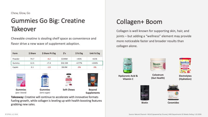 Gummies are gaining share (+277% in dollar growth, +244% in units) while powders remain dominant at 74.7% dollar share but are losing share points. Chewable formats and soft chews are arriving. Creatine is also being combined with hydration, HMB, and energy formulations, and is beginning to appear in the beverage aisle.