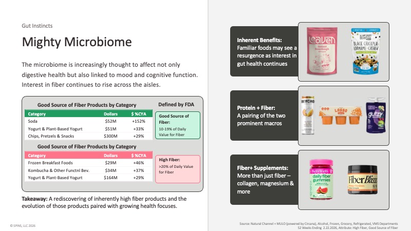 Digestive health has expanded well beyond probiotics. The microbiome is increasingly discussed in relation to mood and cognitive function, and interest in fiber is rising across every aisle.