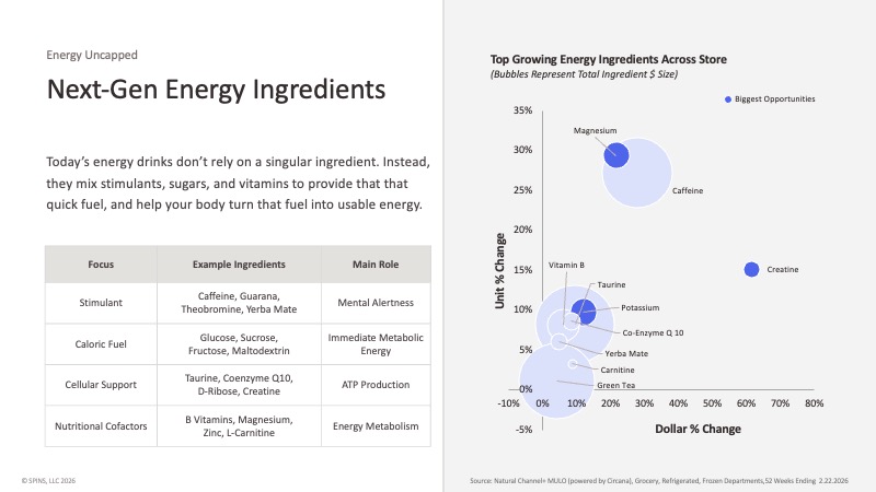 SPINS data indexed against the energy category’s 11% growth shows products layering caffeine with yerba mate and green coffee bean at 1,786 — and stacks adding taurine and L-theanine above 900. The numbers tell the story: complexity is outperforming simplicity.
