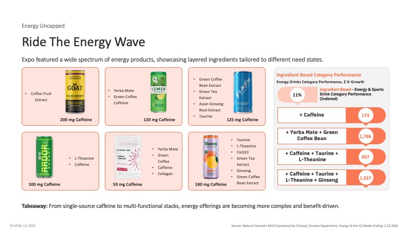 Energy was one of the most active categories on the floor, and the biggest shift isn’t in caffeine levels — it’s in what surrounds the caffeine.