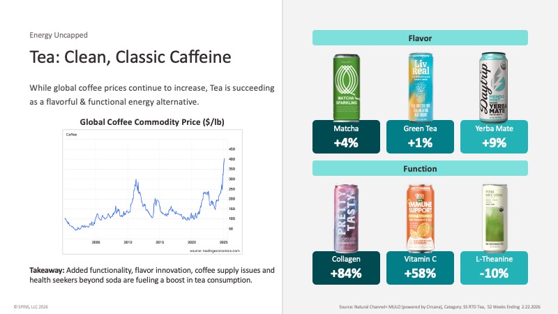 Functional tea is growing fastest in collagen (+84%) and Vitamin C (+58%) — and brands like Pretty Tasty (collagen-infused), Liv Real (green tea caffeine paired with L-theanine and electrolytes), and The Ryl Tea Co (500mg Vitamin C immune support line) are already making the functional play.