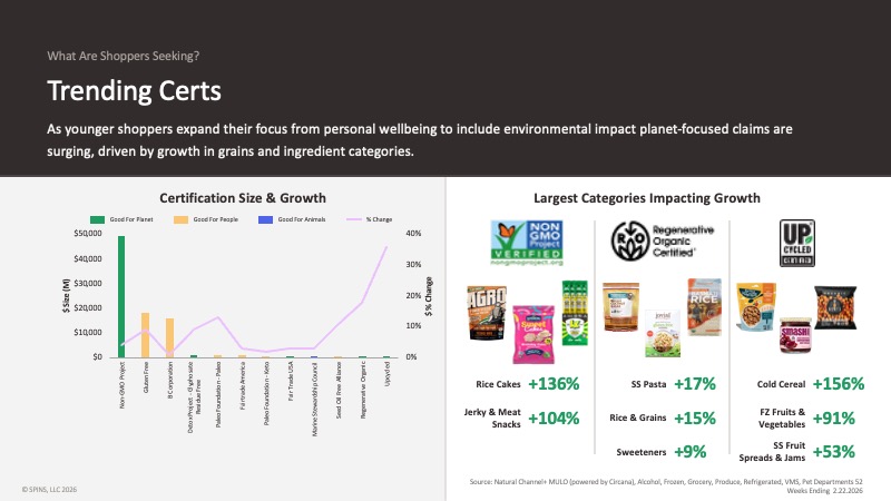 Non-GMO Project still leads in certified-product dollar size by a wide margin. But regenerative organic and upcycled are among the fastest-growing, and the categories driving that growth are telling: cold cereal up 156% in regenerative organic certified sales, rice cakes up 136%, frozen fruits and vegetables up 91%, jerky and meat snacks up 104%.