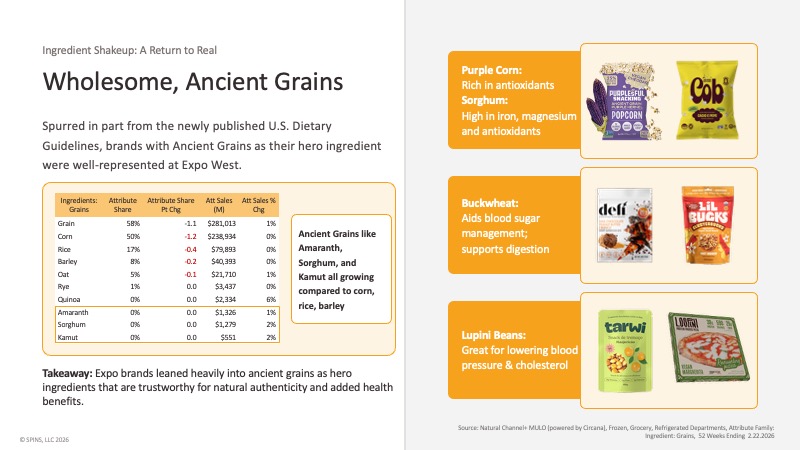 The newly updated U.S. Dietary Guidelines put a specific emphasis on whole grain consumption, and brands took that opening. The framing at Expo wasn’t “healthy” in the abstract — it was “these ingredients fed civilizations.” Purplesful Snacks are built around purple corn, rich in antioxidants. Cob Popcorn led with sorghum. Defi Snacks are centered on buckwheat. Tarwi Andean Lupin Beans offered lupini as a dual protein-and-fiber play. In SPINS data, amaranth, sorghum, and kamut are all growing relative to corn, rice, and barley — still small in absolute dollars, but directionally clear.